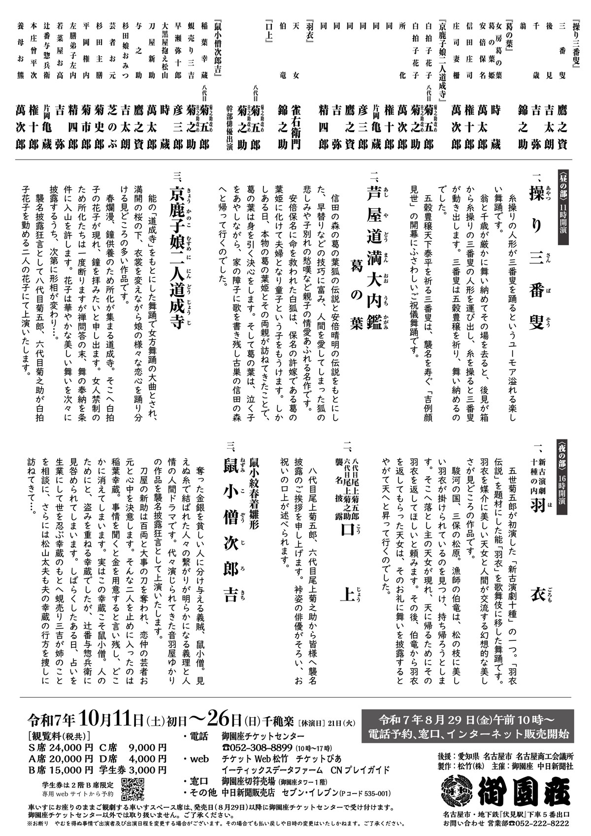ご購入の方は、8月29日午前10時以降に御園座チケットセンターでご予約ください。